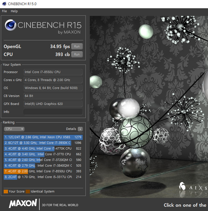 CPU 성능을 알아보기 위해서 씨네벤치를 돌려 봤습니다. CPU 점수는 393cb가 측정이 됩니다. 요즘 나오는 H 모델이나 고성능 데스크탑 CPU와 비교하면 물론 무척 낮은 점수 입니다. 하지만 저전력CPU임을 생각해보면 그렇게 나쁘진 않습니다.