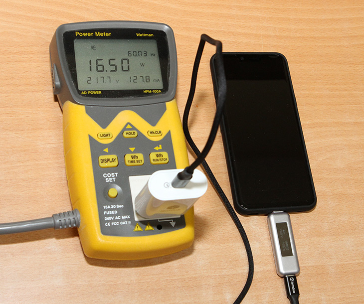 USB-C 테스터기로 실제 인가되는 전력량을 직접 측정을 해 봤습니다. 8.71V 1.61A로 14.02W가 들어가는게 보입니다. 스마트폰의 배터리를 더 떨어뜨리면 더 빨리 충전이 됩니다. 테스트 해본 봐로는 스마트폰이 지원하면 거의 1.65A 가득 채워서 충전이 되었습니다. (1.67A까지 되는 것은 스마트폰에서 제한이 되는 듯 합니다.)