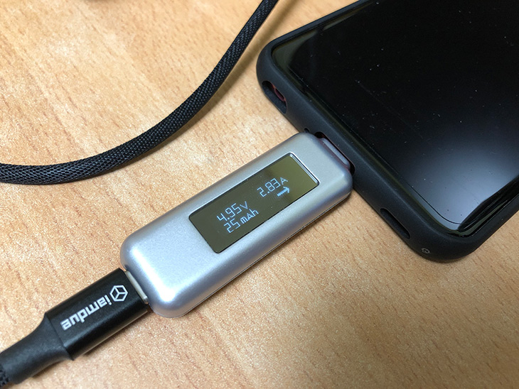 아이폰X의 경우 기본 정품케이블로도 9V의 고속충전이 가능 합니다. 8.93V 1.40A가 들어가는게 보입니다. 고속충전이 되면 일반 충전기에 비해서 더 빠르게 충전이 됩니다. 스마트폰 배터리가 많이 부족할 때 더욱 빛을 발하는데요. 그래서 배터리가 부족할 때 빠르게 사용 가능한 정도까지 충전을 할 수 있습니다. 아침 출근시간때 배터리가 부족한 상황이더라도 잠깐만 꽂아놓고 샤워를 마치고 나오면 바로 충분히 사용할 수 있을만큼 충전이 된다는 것이죠.