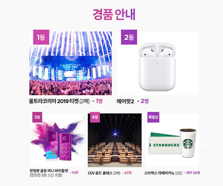 경품으로는 1등은 울트라코리아 2019티켓, 2등은 에어팟2, 3등은 글로 미니 바이올렛, 4등은 cgv 골드 클래스, 특별상으로 스타벅스 아메리카노 1잔을 매주 50명에게 준다고 합니다. 응모를 해보세요.