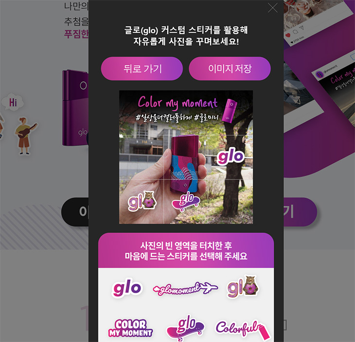 참여 방법은 나만의 즐거운 순간 사진 업로드를 하고 글로 커스텀 스티커로 사진을 꾸민 후 저장해서 sns 공유하면 된다고 합니다.
