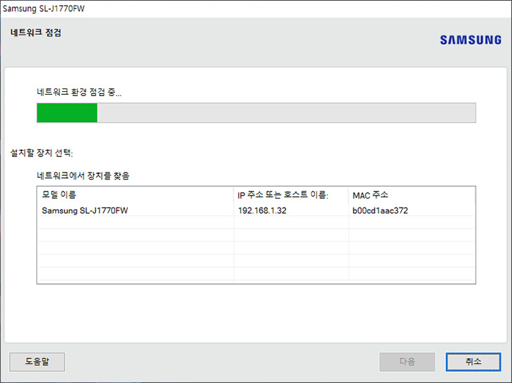 미리 복합기에서 WiFi로 연결을 해둔덕에 설치 프로그램에서 바로 네트워크 연결에서 복합기가 나타납니다. 선택 후 다음을 누릅니다.
