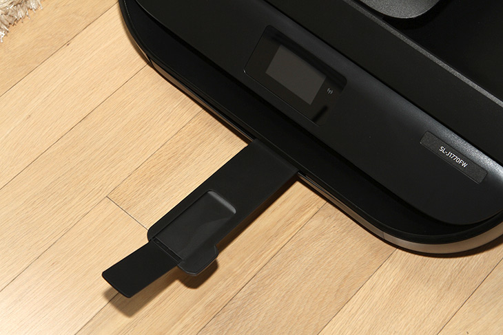 아래 부분에 용지가 나오는 부분 입니다. 그런데 앞으로 뒤어나와 있지 않은데요. 용지가 나온 뒤 잡아주는 부분을 필요할 때만 꺼내서 쓸 수 있습니다. 사용하지 않을 때는 접어둘 수 있어서 좋았습니다.