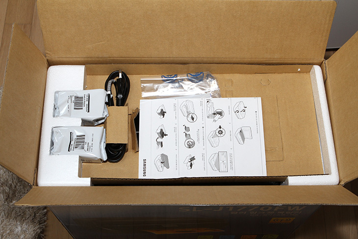 박스를 열어봤는데 내부에 잉크 카트리지와 전원선, 설명서 등이 보입니다.