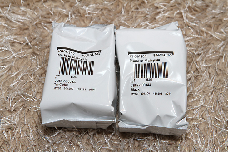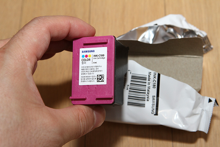 기본 구성품인 잉크 카트리지를 꺼내 봤습니다. 색이 있는 것이 컬러 입니다.