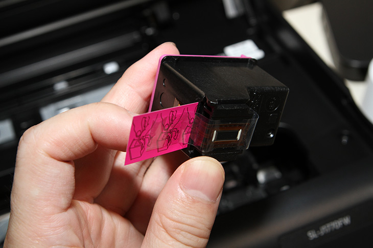 잉크 카트리지 헤더 부분에는 스티커가 붙어 있는데 헤더부분과 접점 부분이 손이 닿지 않게 조심스럽게 스티커를 제거 합니다.