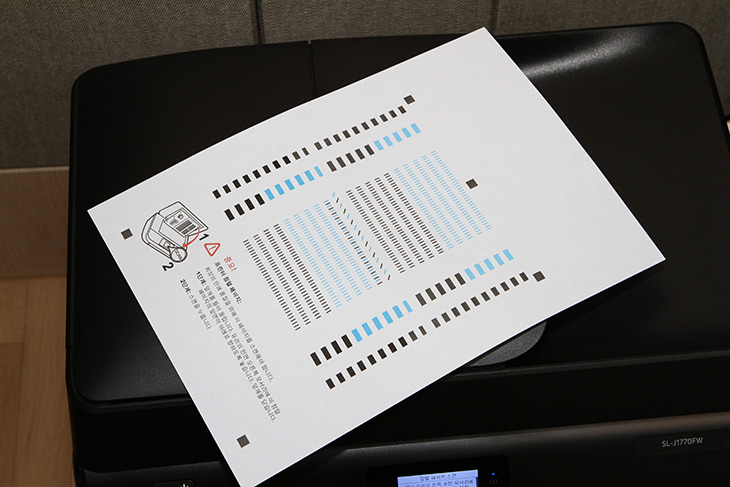 테스트 출력이 진행이 됩니다. 처음 나온 용지는 출력물을 확인하고 모든 부분을 확인하는 역할을 합니다.