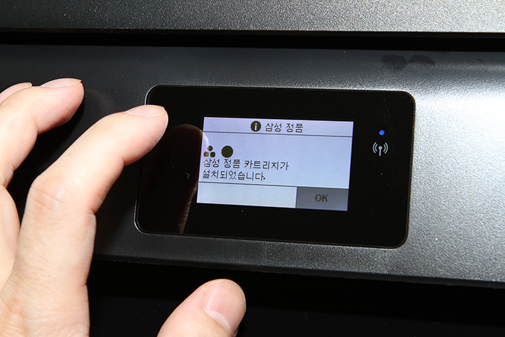 화면은 터치가 가능해서 메뉴 조작이 쉬웠습니다. OK 버튼을 누르면 진행이 됩니다. 처음에는 언어나 나라 설정을 하고 정품 카트리지도 자동으로 인식을 합니다.