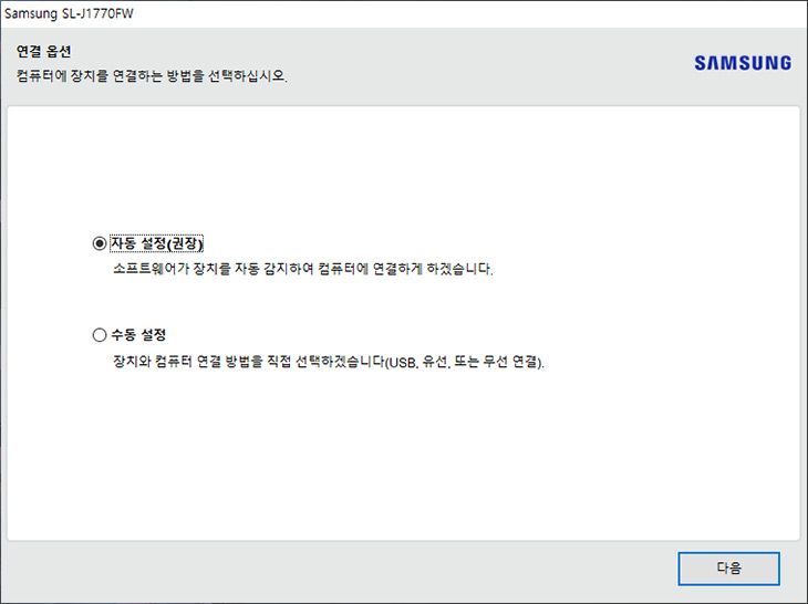 미리 복합기에서 WiFi로 연결을 해둔덕에 설치 프로그램에서 바로 네트워크 연결에서 복합기가 나타납니다. 선택 후 다음을 누릅니다.