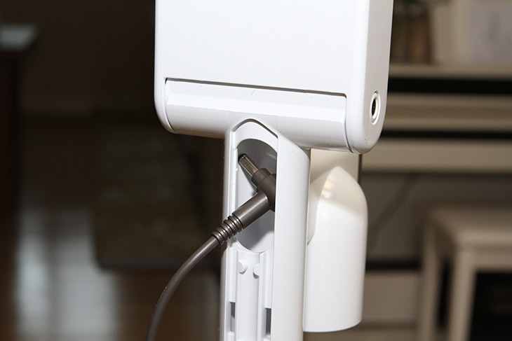 상단에 전원선을 넣어야 하는데 틈이 좁아서 넣는데 좀 힘들었는데요. 요령이라면 위에 거치대 부분을 뒤로 눕혀서 선을 넣으면 쉽게 들어갑니다.