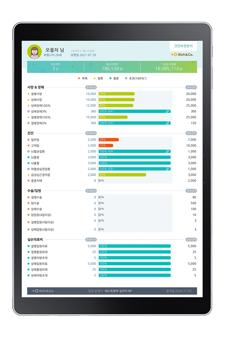 실제로 고객이 태블릿을 앞에 놓고 상담을 받을 때 볼 수 있는 내용인데요. 한눈에 보는 보장 현황에서 내가 어떤 상품에 가입되어 있고 어떤 혜택을 받을 수 있는지 볼 수 있습니다.