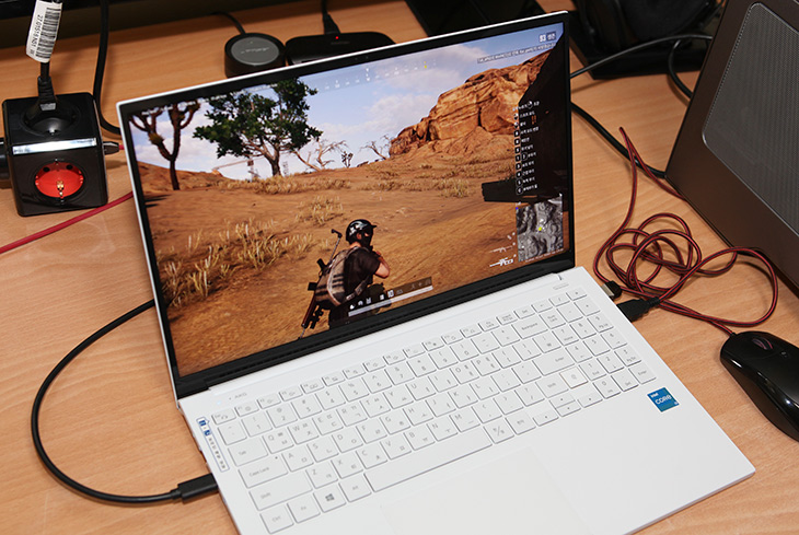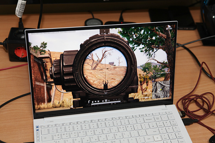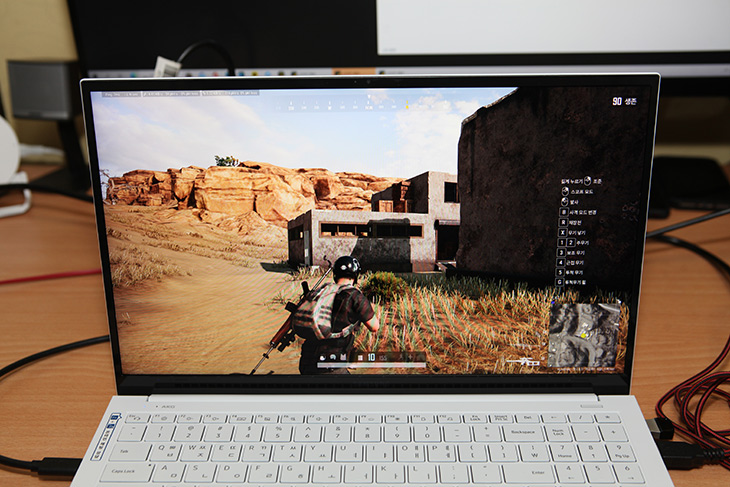 배틀그라운드 게임을 할 때 옵션을 최대로 올려서 해 봤습니다. 그렇게 해도 끊김없이 게임이 가능합니다. 물론 이 노트북의 화면주파수가 60Hz이므로 아주 부드러운 체감까지는 어렵지만 게임이 매우 어려운 상황에서 게임이 부드럽게 돌아가는 정도까지는 가능하죠.