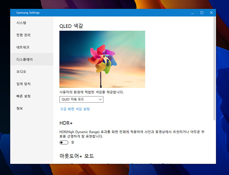 QLED 색감을 지원합니다. 색이 확실히 뭔가 좀 다르게 보입니다. 전문가용 모니터처럼 넓은 색표현력을 보여줍니다.