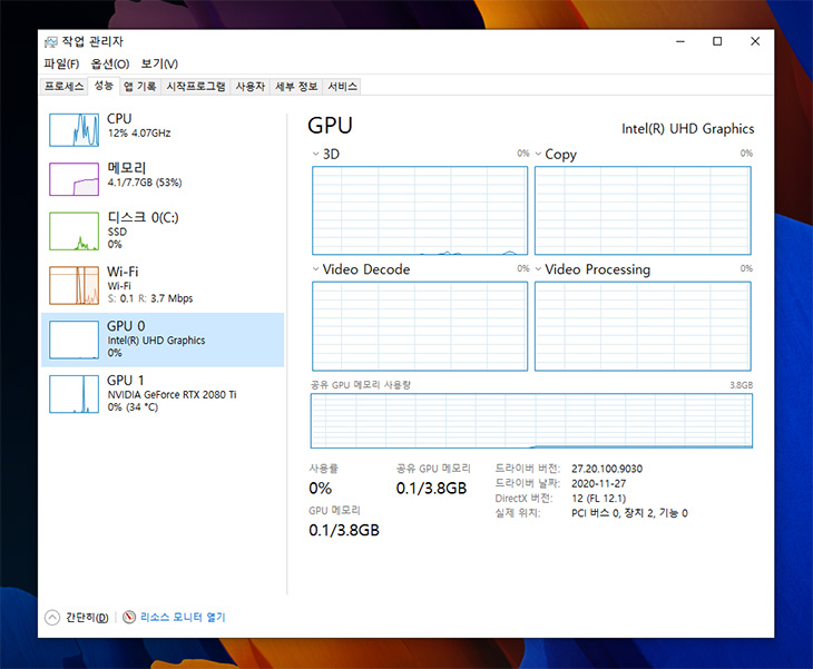 썬더볼트4로 연결이 되고 RTX2080 Ti가 온전하게 인식된게 확인이 됩니다. 이렇게 되면 그래픽성능이 크게 올라갑니다.