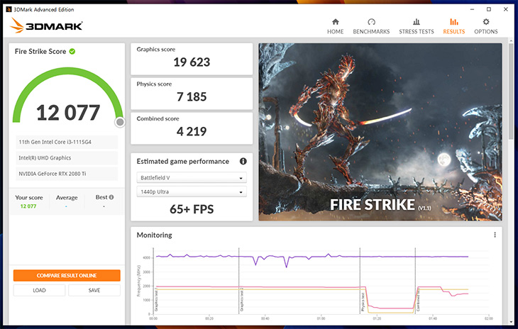RTX2080Ti XTREME를 연결한 상태로 3DMARK FireStrike 테스트를 해보니 그래픽점수가 19623점이 나옵니다. CPU가 만약 4코어 8쓰레드였다면 점수가 더 많이 올라갔을듯하지만 그래도 준수한 성능이 나옵니다. 게이밍 컴퓨터에서나 나오는 점수가 이 노트북으로도 나오는 것이죠.
