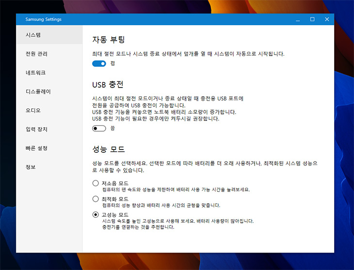 삼성 셋팅도 쓸만한데요. 이 툴은 아주 옛날부터 있었지만 이제는 윈도우10 스타일로 잘 꾸며진 것 같습니다. 화면을 열면 자동으로 부팅이 되도록 할 수 있으며 USB 충전과 성능모드를 선택을 할 수 있습니다.