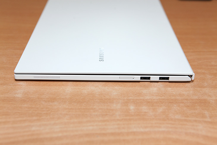 오른쪽에는 UFS와 USB 단자가 2개가 있습니다. 아래쪽 양쪽에는 스피커홀이 있습니다. 측면에 핀홀이 뚫려 있는데 덕분에 사운드가 좋습니다. 기존에 일부 노트북의 경우 핀홀의 위치가 조금 엉뚱하게 있어서 소리가 먹먹한 제품이 있었는데요. 삼성 노트북의 경우에는 사운드가 좋습니다.