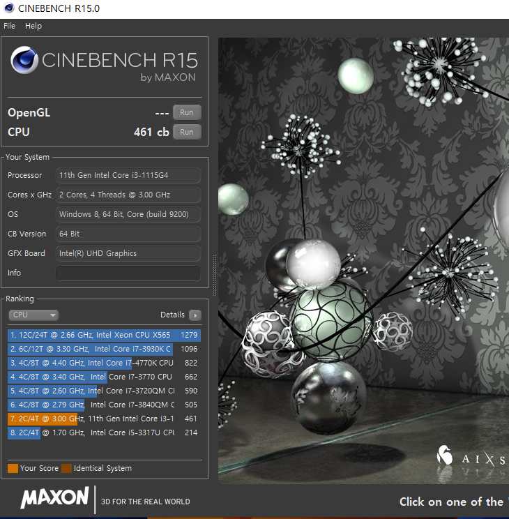 CPU 성능을 알아보기 위해서 씨네벤치 R15를 돌려봤습니다. CPU 점수는 461 cb가 나옵니다. 이전 세대 노트북은 이것보다 점수가 좀 더 낮은데요. 고성능의 데스크탑 CPU를 쓰던 분들은 점수가 2000점을 넘어갈텐데요. 점수가 너무 낮은거 아닌가 싶을 수 있지만 씨네벤치는 멀티코어의 성능만 확인하는것이라 클럭이 아무리 높아도 코어갯수가 적으면 점수가 상대적으로 좀 낮게 나오긴 합니다. 다만 노트북임을 감안하고 2코어임을 감안해보면 기존보다는 성능이 조금 올라가긴 했습니다.