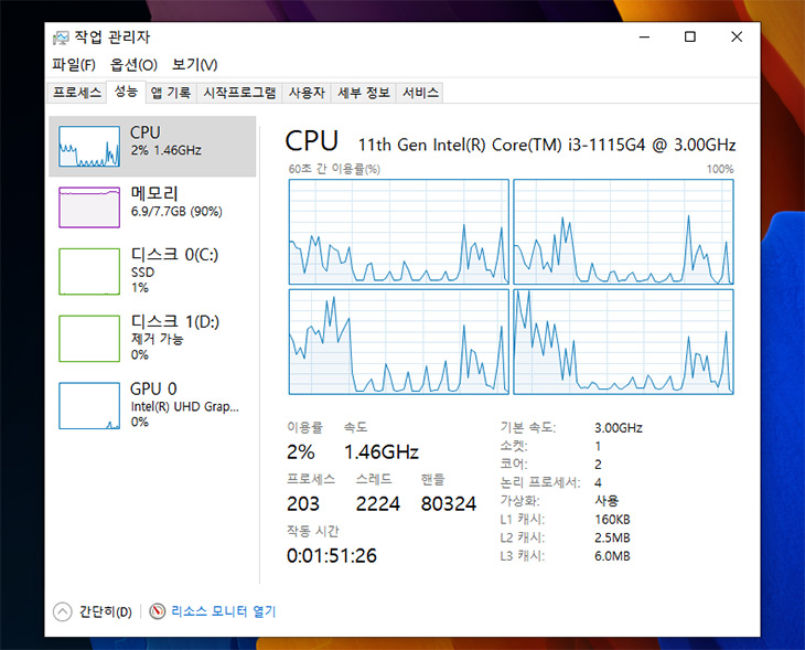 이온에서 이온2로 넘어오면서 프로세서도 바뀌었는데 11세대 i3-1115G4가 사용되었습니다. 2코어 4쓰레드로 동작하는 형태라 기존에 2코어 노트북들과 별 차이가 있을까 싶지만, 클럭이 상승했고, 전력소모량은 비슷합니다. 정리하면 전력은 비슷하게 쓰는데 기존보다 성능이 더 좋아졌다는 것이죠.