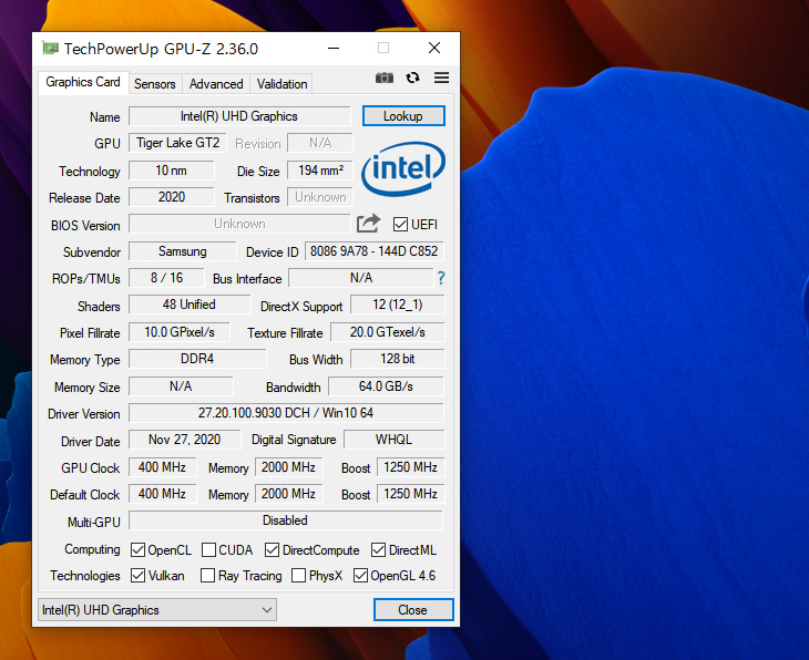 내장그래픽으로는 타이거 레이크 GT2의 UHD Graphics가 사용됩니다.