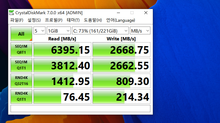 SSD는 정말 좋은게 들어간 느낌인데요. 순차읽기속도가 6395MB/sec에 달합니다. 쓰기 속도도 2668MB/sec로 아주 빠른 편입니다. 성능을 내는데 있어서 SSD가 발목 잡을일은 없을 것 같네요.