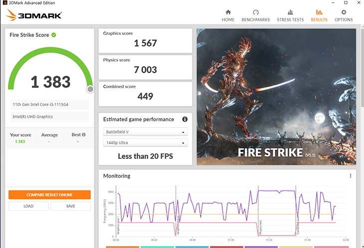 내장그래픽의 성능도 확인해 봤습니다. 3DMARK FireStrike 기준으로 그래픽점수는 1567점 정도가 나옵니다. 점수는 내장그래픽정도의 성능이 나왔습니다.
