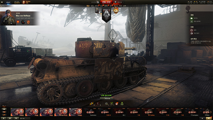 로비화면인데요. 탱크를 선택을 할 수 있죠. 탱크는 여러대를 운용할 수 있고 업그레이드가 가능합니다. 한번 전장에서 킬 당하게 되면 그 전장이 끝나기 전에는 같은 탱크는 운용할 수 없어서 실제로는 여러 탱크를 운용할 수 밖에 없습니다. 그리고 탱크도 경전차에서 대형까지 다양하게 있고 곡사포도 있고 하여 고르는 재미가 있습니다.
