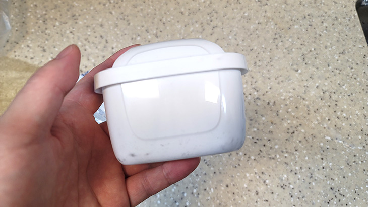 필터를 꺼냅니다. 필터는 따로 비닐포장 되어있네요. 근데 꺼내보면 약간 표면이 거뭇거뭇합니다. 내부에 활성탄이 있는데 그게 좀 뭍어나와서 그렇습니다.
