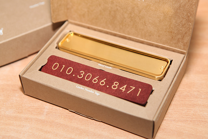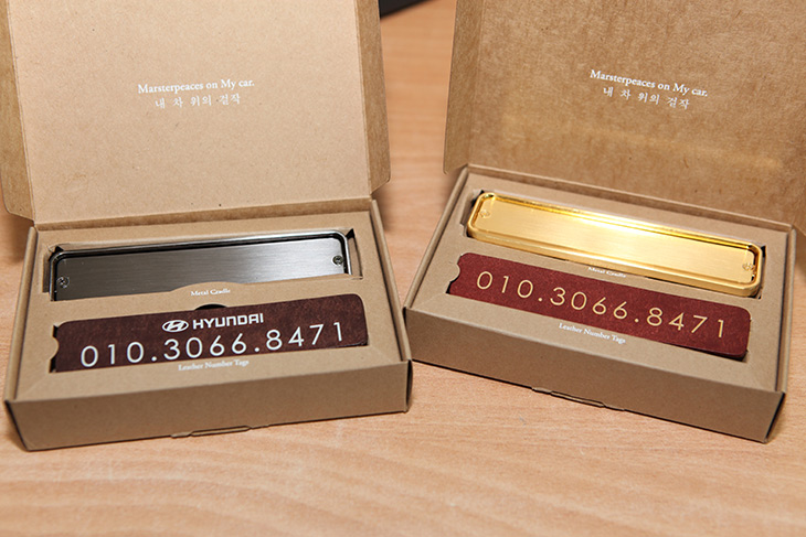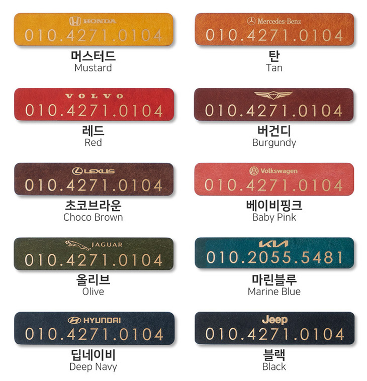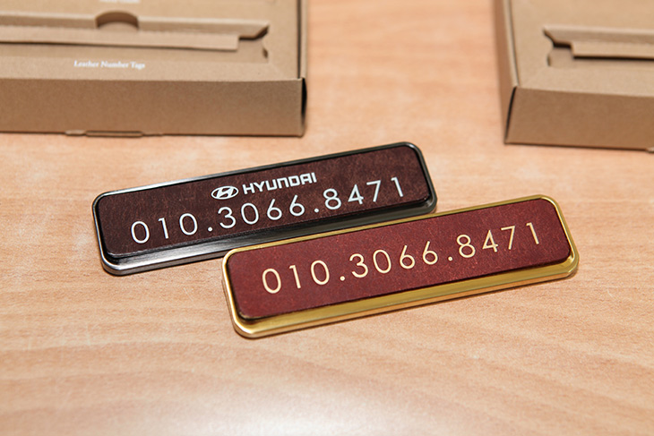 자동차 로고는 넣을 수 도 있고 뺄 수 도 있습니다. 뺀것도 심플한 것 같아요. 글자 색상이 금장으로 들어가서 엄청 이쁩니다. 그런데 가죽에 직접 글자를 넣는 형태라서 번호를 나중에 바꾸거나 할 수 는 없습니다. 대신 디자인이 심플하고 고급스럽다는 장점이 있죠.