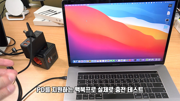 맥북프로나 노트북이 USB-C PD 충전을 지원한다면 최대 100W 충전까지도 이용할 수 있습니다. 맥북프로를 충전을 해 봤는데 충전이 잘 되네요. 100W 충전시에는 다른포트를 쓰지 못하지만 일반적인 멀티충전케이블에서는 할 수 없는 100W 충전이 되니 확실히 활용도가 좋습니다.
