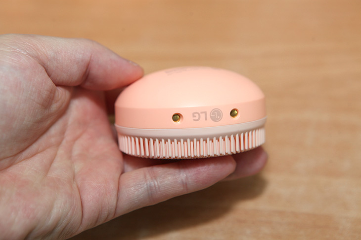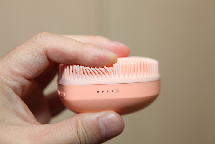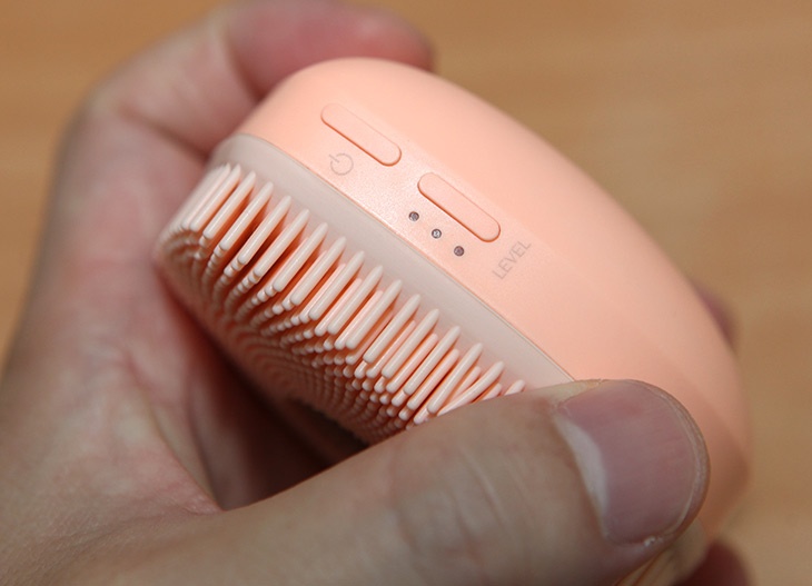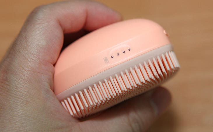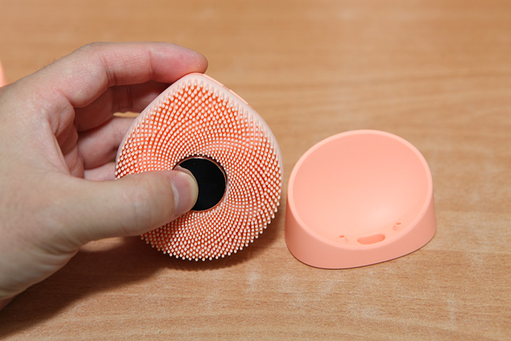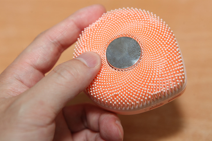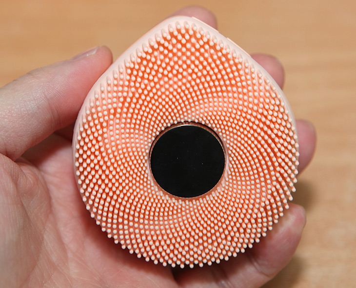 실리콘 브러시는 모양도 꽤 이쁘게 만들어져 있는데요. 가장자리는 좀 굵고 가운데는 촘촘하면서 작은 솔이 사용이 되었습니다. 가운데 초음파 헤드 부분은 물에 녹슬지 않는 강한 내구성을 가진 SUS316L 소재로 만들어져 있습니다. 실리콘 솔이 사용되어서 부드럽다는 느낌은 드는데 이때까지는 이런 솔로 세안이 잘 되나? 라는 생각도 잠깐 들었습니다. 실제 느낌은 아래에서 전해볼께요.