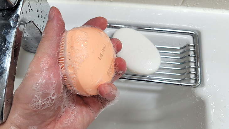 LG 프라엘 워시팝을 사용을 해 봅시다. 비누로 얼굴을 문지르고, 워시팝도 물에 적셔 줍니다.