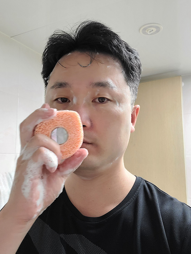 하루 뒤 한번 더 써 봤습니다. 한손으로 찍었지만 양손으로 비누칠 하면 꼭 그냥 비누 문지르는 것 같습니다. 디자인도 약간 비누 모양이고..