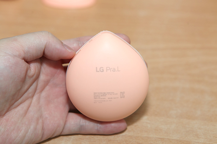 한손에 쏙 들어오는 사이즈 인데요. LG 프라엘 워시팝은 IPX7 등급 (1미터 수심 30분간 사용 가능)을 지원합니다. 물에 넣어도 되나? 이런 걱정 있는 분들은 일단 넣어도 됩니다. 물속에서도 사용이 가능하구요. 제품에는 LG Pra.L 이라고 로고가 보이고 KC인증마크도 보이는데요.
