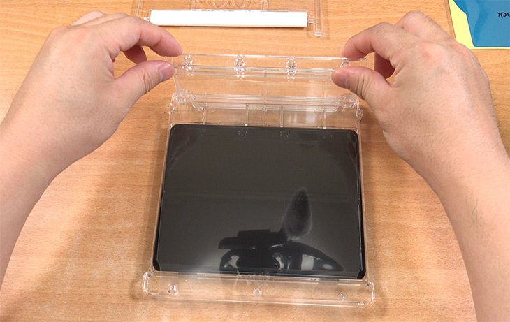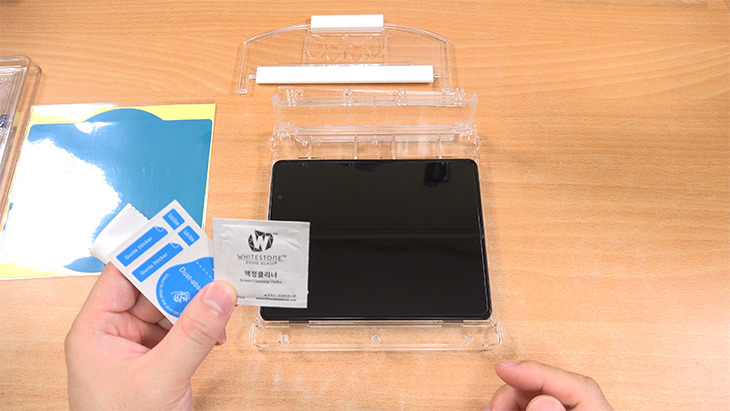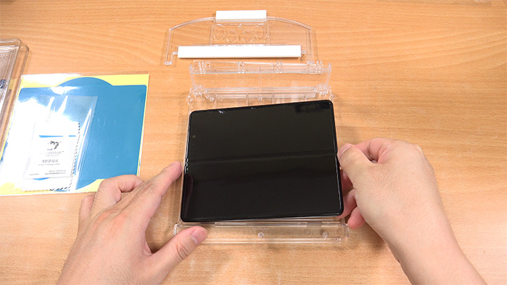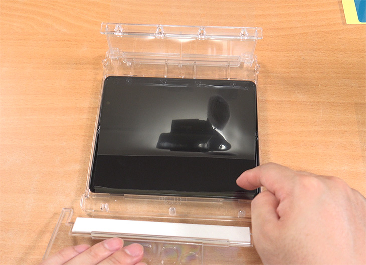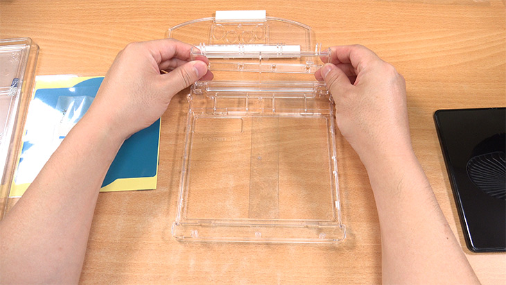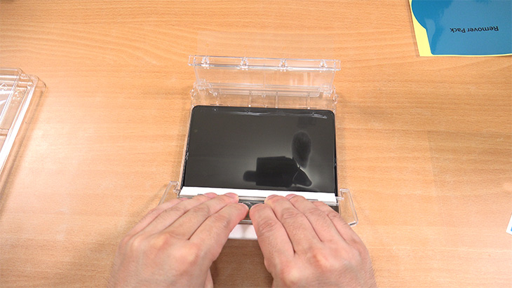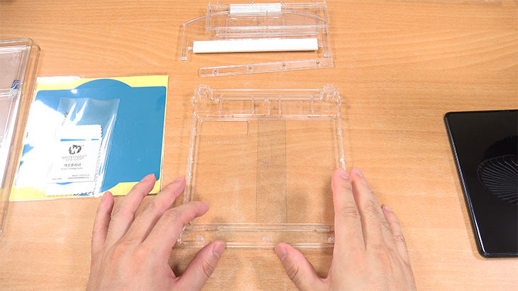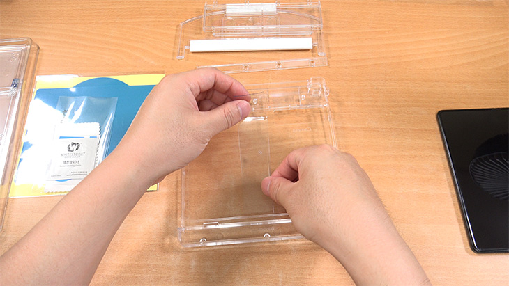 상단 부분에 얼라인 블럭을 고정을 합니다. 보호필름이 자연스럽게 붙도록 임시로 잡아주는 역할을 하는 부분 입니다.