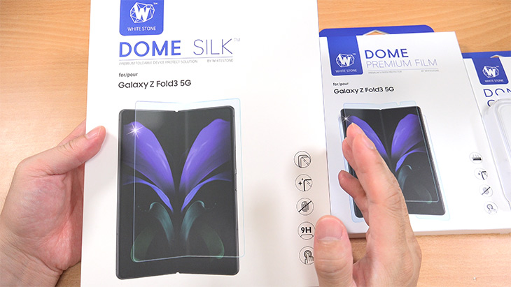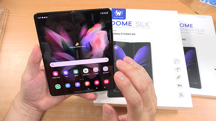 화이트스톤에서는 DOME SILK 라는 제품을 내놓았습니다. UTG 타입의 강화유리 보호필름인데요. 강화유리인데 접을 수 있는 UTG 입니다. 5만번 이상 접었다 폈다 반복하며 테스트를 마친 제품 입니다. 상성 Z폴드3에 원래 화면에 있는 UTG와 거의 같은 재질이라고 봐도 됩니다.