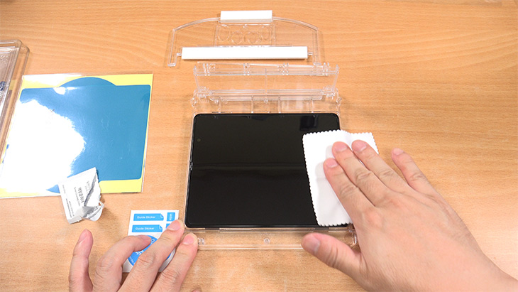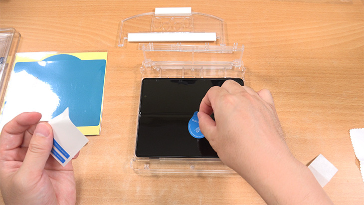 수시로 먼지 제거 스티커를 이용해서 화면에 있는 작은 먼지를 제거 합니다. UTG 위에 UTG를 올릴 것이므로 먼지가 들어가면 안되므로 먼지를 잘 제거 합니다.