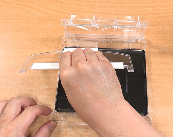 스쿼지를 이용해서 천천히 밀어서 붙입니다. 기포가 중간에 들어가지 않도록 천천히 밀어서 설치 합니다. 중간에 공기가 들어가면 들어올려 다시 천천히 밀어서 붙입니다. 강화유리 경우 중간에 기포가 들어갔을 때 나중에 밀어서 뺄 수 있을테지만 UTG는 워낙 얇고 잘 떨어지지 않아 기포 빼기가 어려워서 처음부터 기포가 안들어가게 설치해야 합니다.