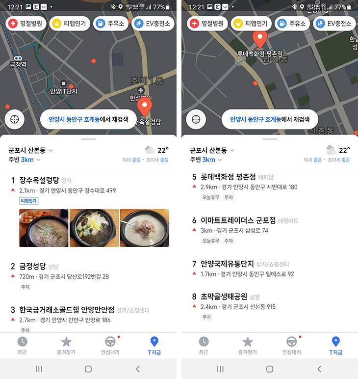 T맵을 실행 후 오른쪽 아래에 있는 T지금을 선택을 합니다. 현재 시각에 자신의 위치 주변으로 어디에 사람이 많이 갔는지 볼 수 있습니다. 이런 이유로 시간대별로 검색결과는 좀 달라질 수 있습니다.