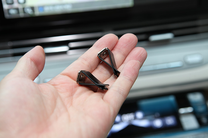 실제로 차량에 설치를 해 봤는데요. 클립을 고정을 해야 합니다. 클립은 좀 강하게 잡히는 형태라 손으로 좀 늘려도 될 것 같습니다. 클립에는 차량 기본 구성품이 손상되지 않도록 고무로 덮혀 있습니다.