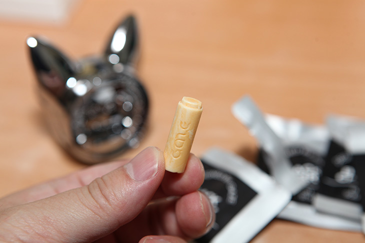 하나를 꺼내 봤는데요. 고체타입이라 이렇게 손으로 만질 수 있습니다만, 근데 손에 뭔가 살짝 방향제 액체가 뭍어납니다. 맨손으로 만졌다면 손은 씻으면 됩니다. 느낌상 나무심지에다가 엄청 방향제를 적셔둔듯한 그런 느낌이예요.