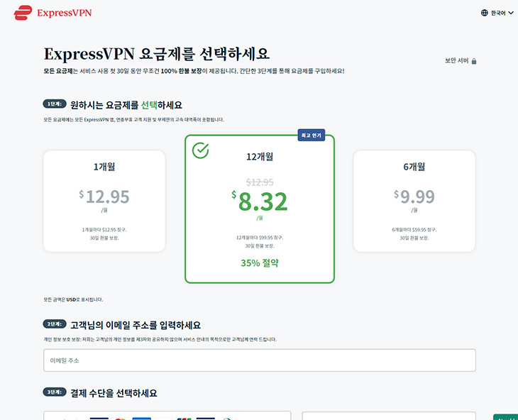 사이트에 ExpressVPN 가입을 누르면 바로 요금제를 선택하고 가입이 가능한데요. 별다르게 회원가입을 하지 않아도 가입하면서 나온 번호를 이용해서 바로 이용이 가능했습니다. 원하는 요금제를 선택을 합니다.