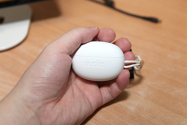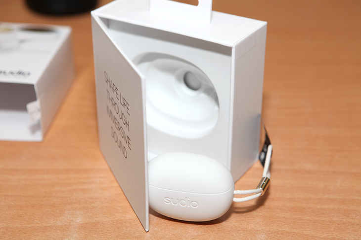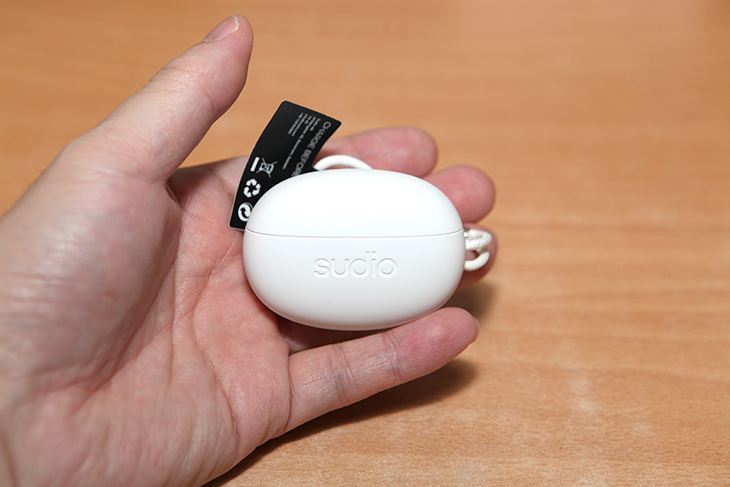 실제로 제품을 만져봤을 때 촉감이 무척 좋았습니다. 살짝 보드라운 느낌도 있습니다. 약간 하얀 비누 만지는 듯한 느낌이 있습니다. 전면에는 sudio 로고가 있습니다.