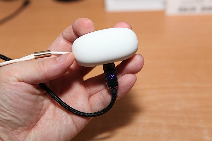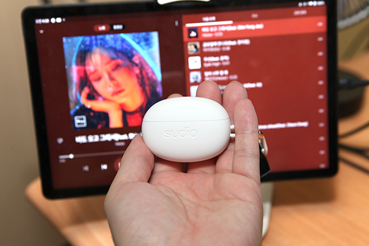제품을 열어보면 이어폰이 보이는데, 커버를 열면 바로 이전 페이링된 장치에 바로 연결이 됩니다. 다른 블루투스 이어폰은 덮개를 열고 빼야 실제로 연결이 되기도 하던데 이 제품은 커버만 열면 연결이 되어서 소리가 블루투스 이어폰쪽으로 나오긴 하더군요.