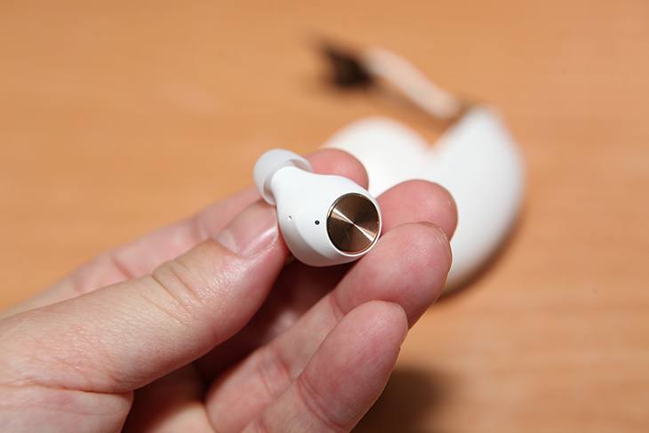 안쪽 부분에는 핀이 2개가 보이는데 충전을 위한 부분입니다. 근데 그 외에도 안쪽에 마이크가 위치하는데요. 양쪽에 2개씩 총 4개의 마이크를 이용해서 빔포밍 마이크를 구현합니다. 선명한 목소리를 전달하는데 , 음성통화를 많이 하는 분들도 괜찮습니다. 물론 물리적으로 마이크가 귀 위치에 있기 때문에 마이크를 별도로 이용하는 형태의 제품보다 성능이 떨어질 수 는 있으나 이런 마이크에 특화된 기능이 없는 제품에 비해서는 성능이 훨씬 좋습니다.