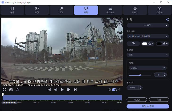 자막을 넣는것도 가능한데요. 자막파일을 불러와서 넣는게 가능하네요. 이정도면 간단하게 영상을 찍어서 잘라서 편집하고 자막넣고 하나의 파일로 만드는게 가능하네요.