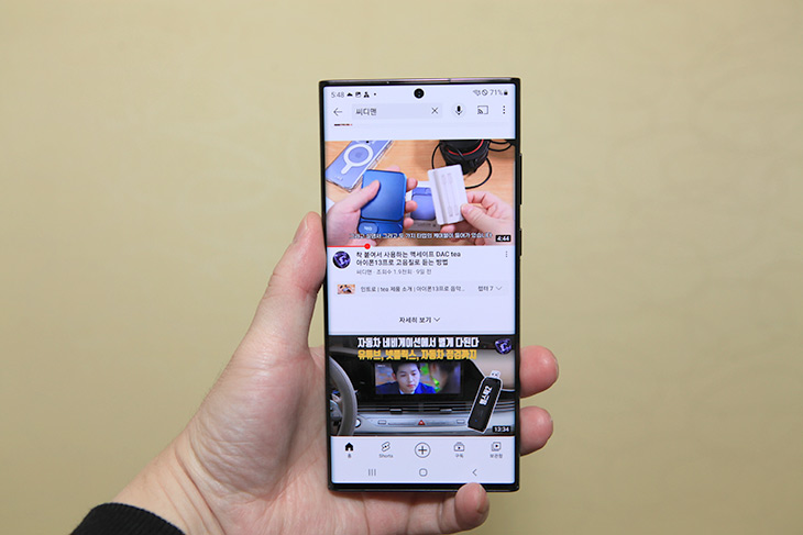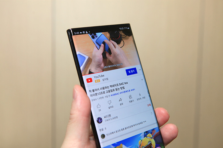 갤럭시S22 울트라는 이제는 노트시리즈라고 불러도 될 정도로 화면더 크고 각진 디자인으로 이전 노트와 거의 같게 나왔습니다. 사이즈 대비 넓은 화면비 때문에 정말 화면이 커 보이는데요.