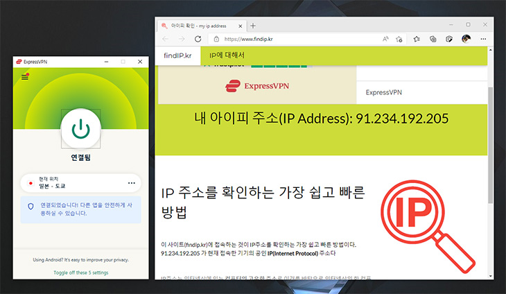 Express VPN를 껏다가 다시 켜 봤는데 그래도 아이피가 바뀌게 됩니다. 아이피 끝자리가 바뀌긴 하지만 이것은 시간과 상황에 따라 계속 바뀌게 됩니다.