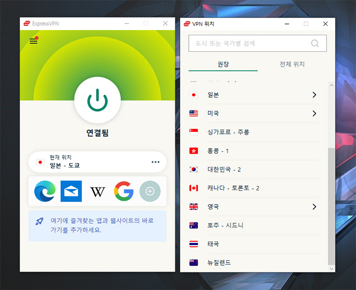 VPN 위치를 변경 해서 다른나라로 변경하는 것도 가능합니다. 꽤 다양한 국가를 지원을 하는데요.
