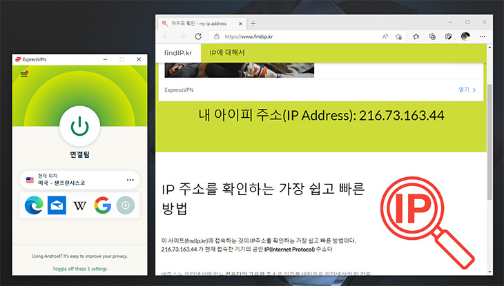 미국으로 위치를 바꿔봤는데 이렇게 하면 또 아이피가 바뀌게 되죠.
